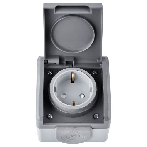 Розетка открытой установки 1-мест. с/з с з/ш с крышкой 16А серый IP55 ПРАЛЕСКА АКВА (РФ)